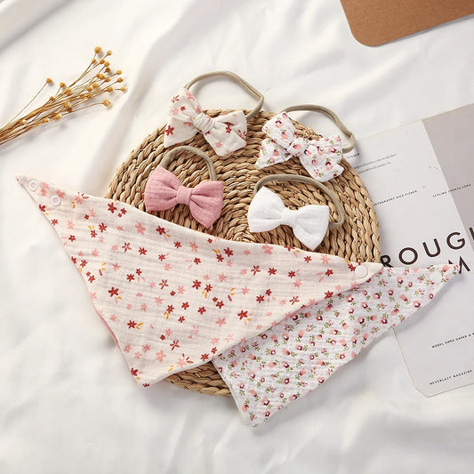 Flower Print Cotton Linen Baby Girl Bibs Elastic Nylon Headband