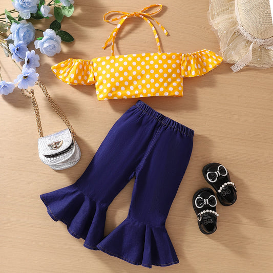 Weißes Langarmshirt für Babys und Mädchen, 2-teiliges Set mit blauer Schlagjeans