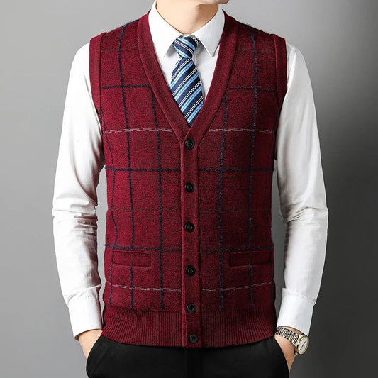 Ärmellose Herrenweste mit Karomuster, V-Ausschnitt und Strickmuster