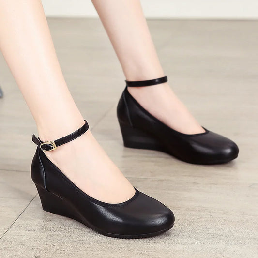 Elegante Damenschuhe aus schwarzem Leder mit dünnem Absatz für die Arbeit