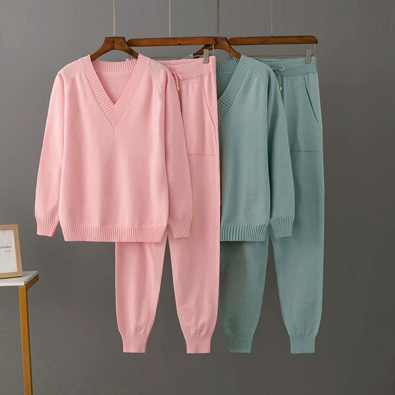 Damen Strick-Sportanzüge mit V-Ausschnitt, Jogginghose, Pullover