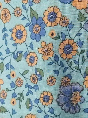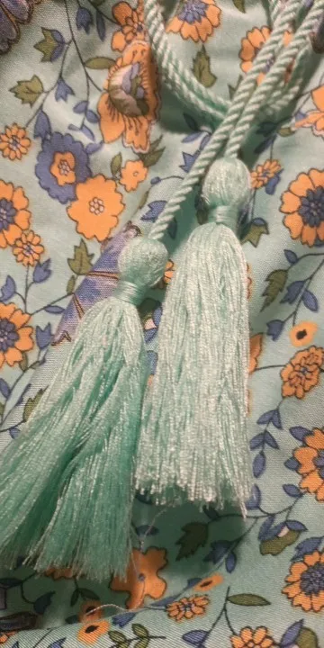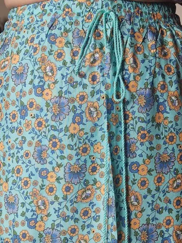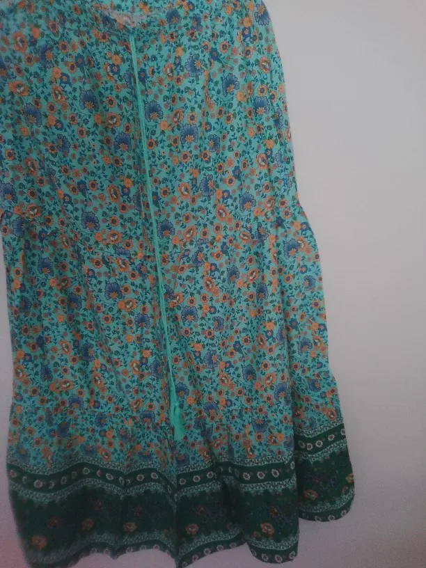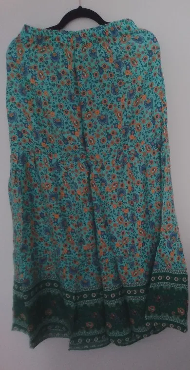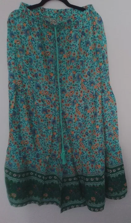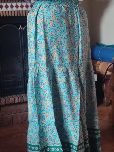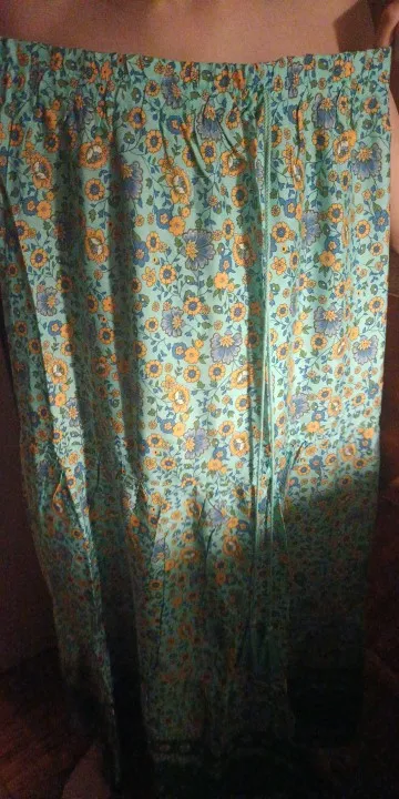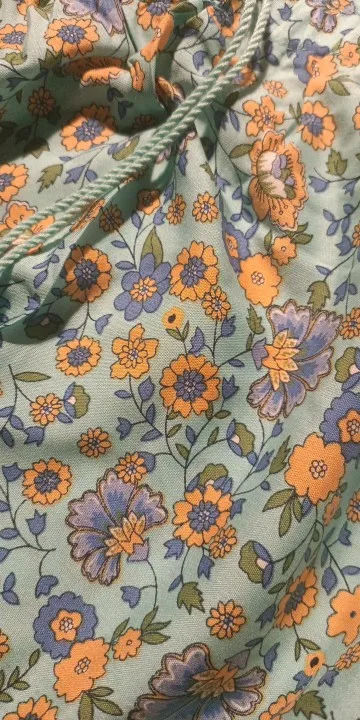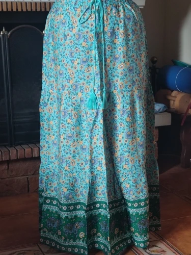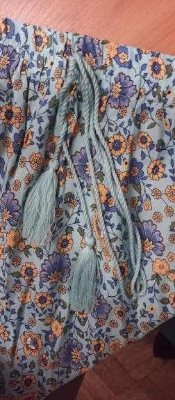 The material is very good, it's a perfect cool skirt for summer or transitional weather. The design of the yellow flowers looks very nice in contrast with the complementary blue of the background. The hem is a water green tone that also looks great with the skirt set. It has a drawstring to adjust it to the waist using an elastic.