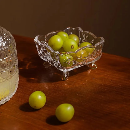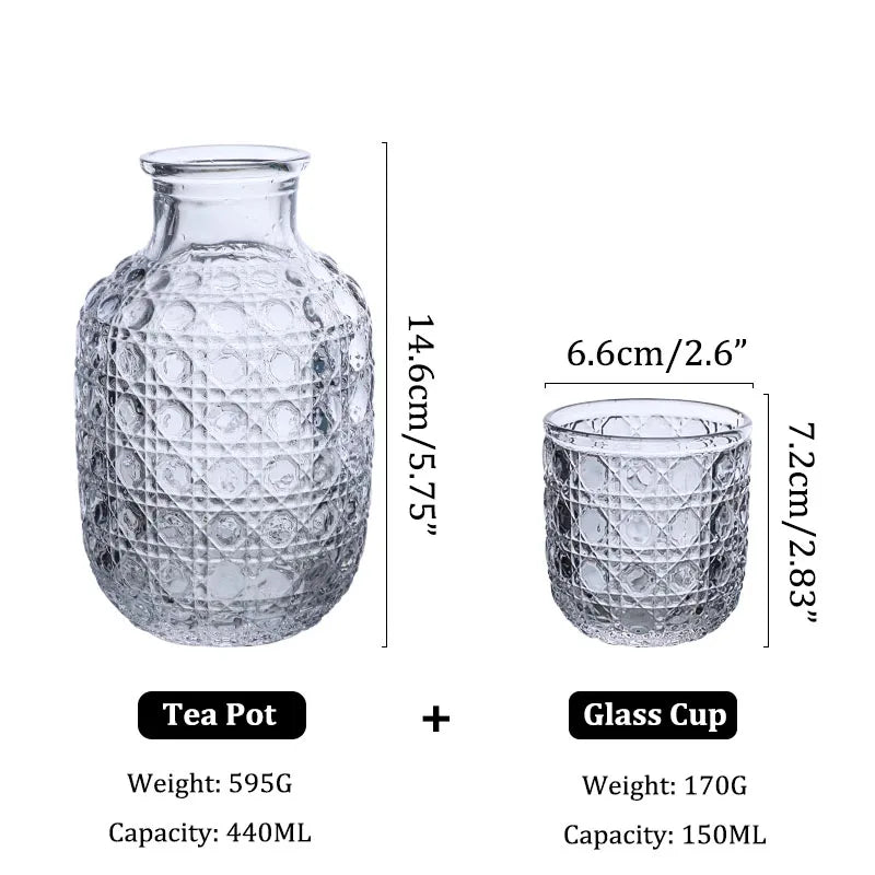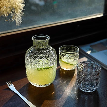 【 Vintage-Prägestil 】: Eine Verschmelzung von klassischem Prägedesign und kristallklarem Glas ergibt ein Wasserkaraffen-Set für den Nachttisch, das Ihren Nachttisch sofort mit einem Hauch von Adel und Raffinesse aufwertet und Ihren tadellosen Geschmack widerspiegelt.
