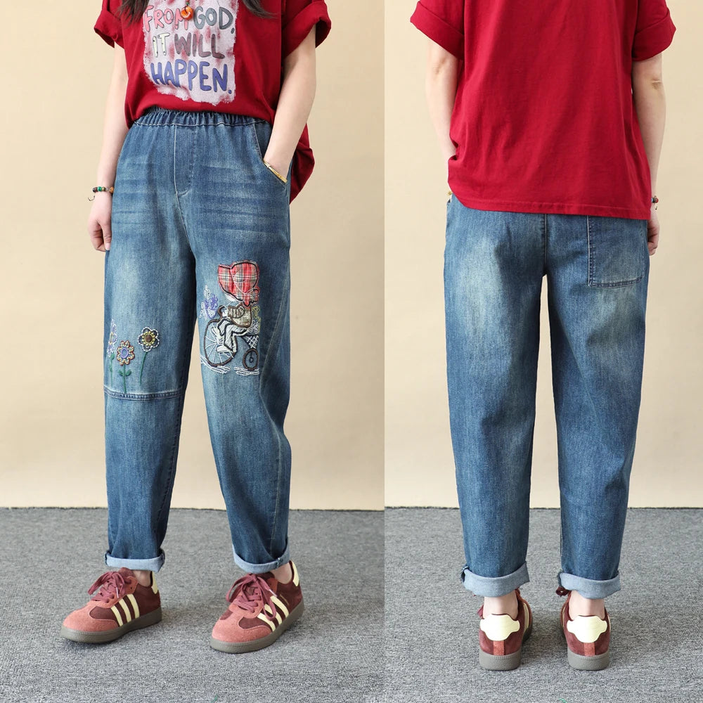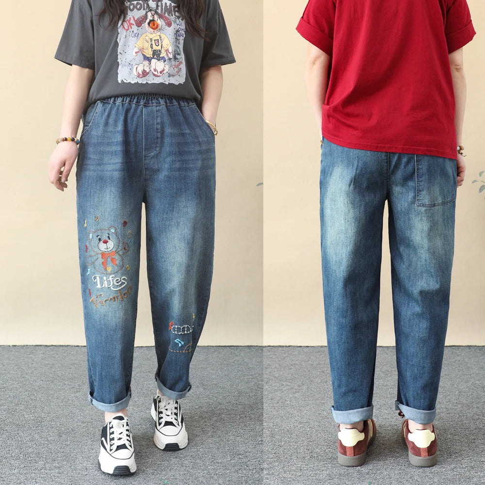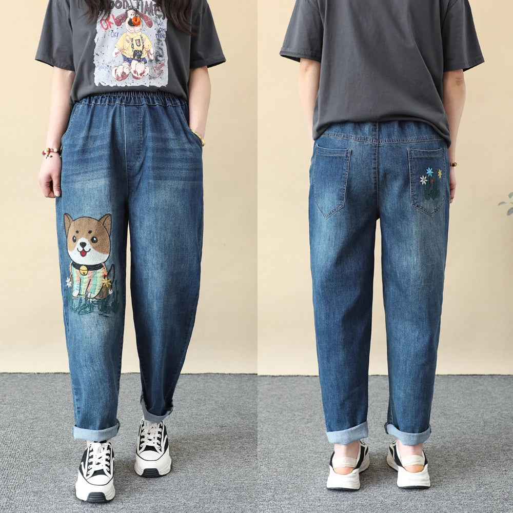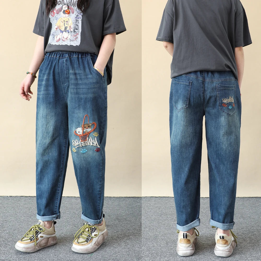 6537 Cartoon Wurf Mädchen Stickerei Denim Hosen Für Frauen Trendy Loch Casual Hohe Taille Reithose Taschen Mom Harem Blue Jeans LFFMHMT