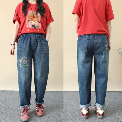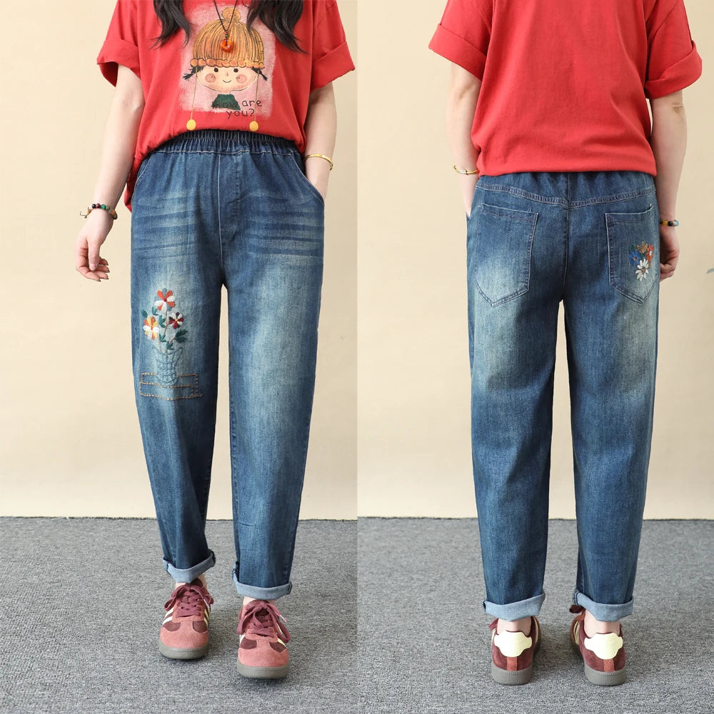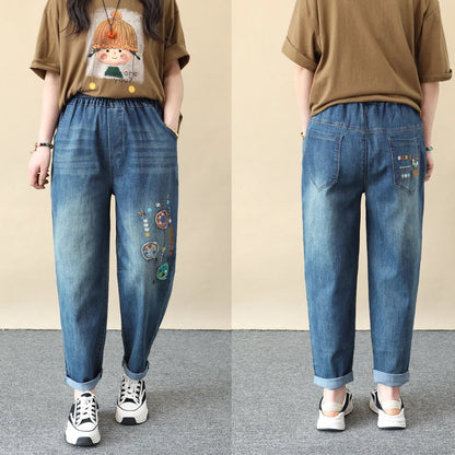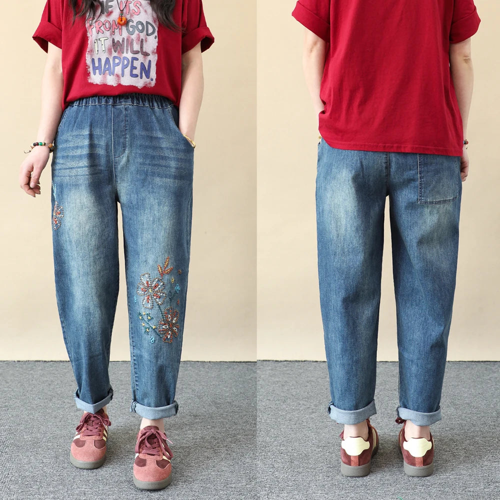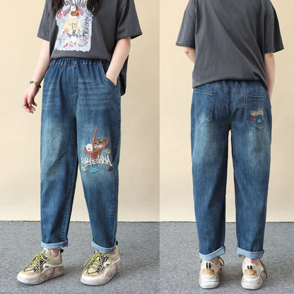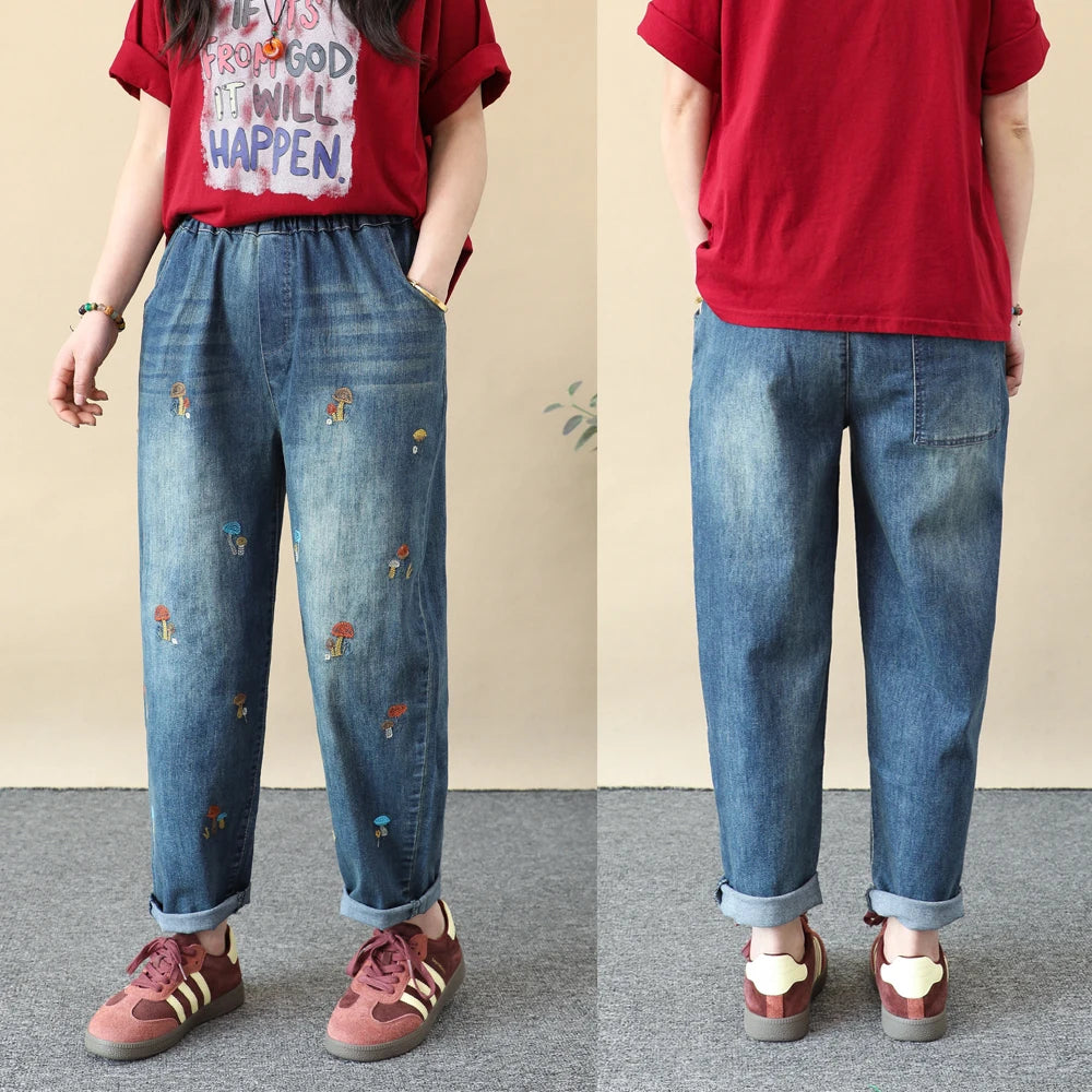 6537 Cartoon Wurf Mädchen Stickerei Denim Hosen Für Frauen Trendy Loch Casual Hohe Taille Reithose Taschen Mom Harem Blue Jeans LFFMHMT