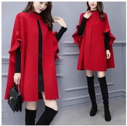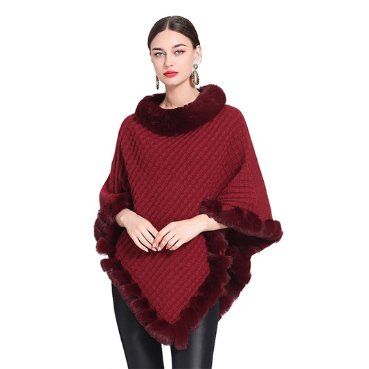 Poncho-cape tricoté à col en fausse fourrure pour femme