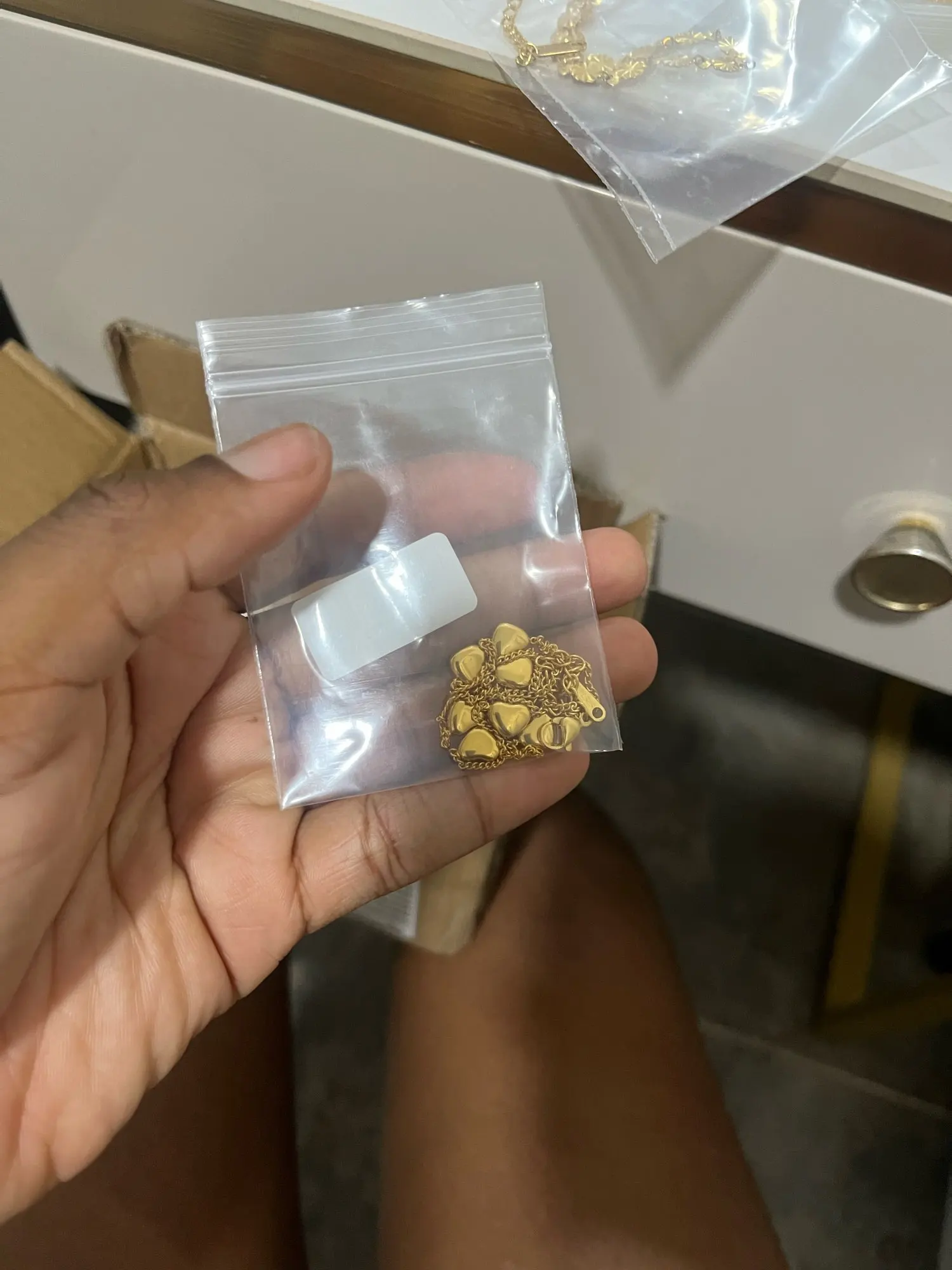 Jeromy Bins Smaller than it look in the picture however it’s very beautiful and dainty good for everyday look the gold color is abut to yellow but it’s nice
