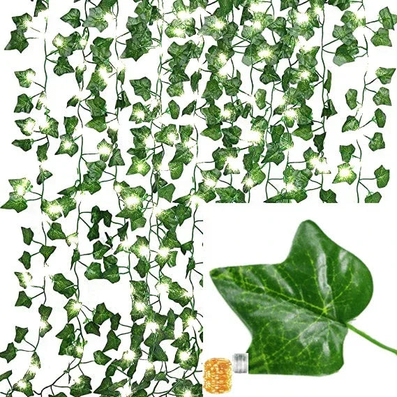 1. Lierre artificiel en soie et plastique de haute qualité. Chaque vigne décorative mesure environ 7 pieds de long, avec 24 tiges au total, soit environ 2 mètres au total. Chaque lierre a 72 feuilles et les feuilles mesurent environ 1,5 à 1,8 pouces. Vous recevrez également deux guirlandes LED de 2 mètres de long contenant 20 lumières LED (piles non incluses).