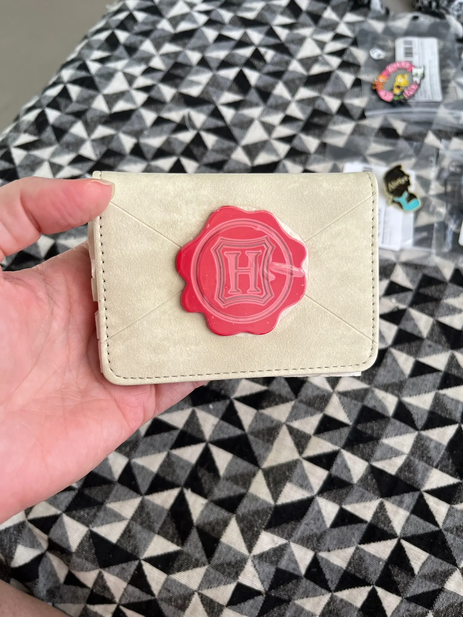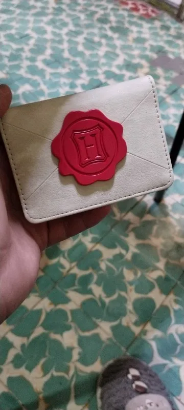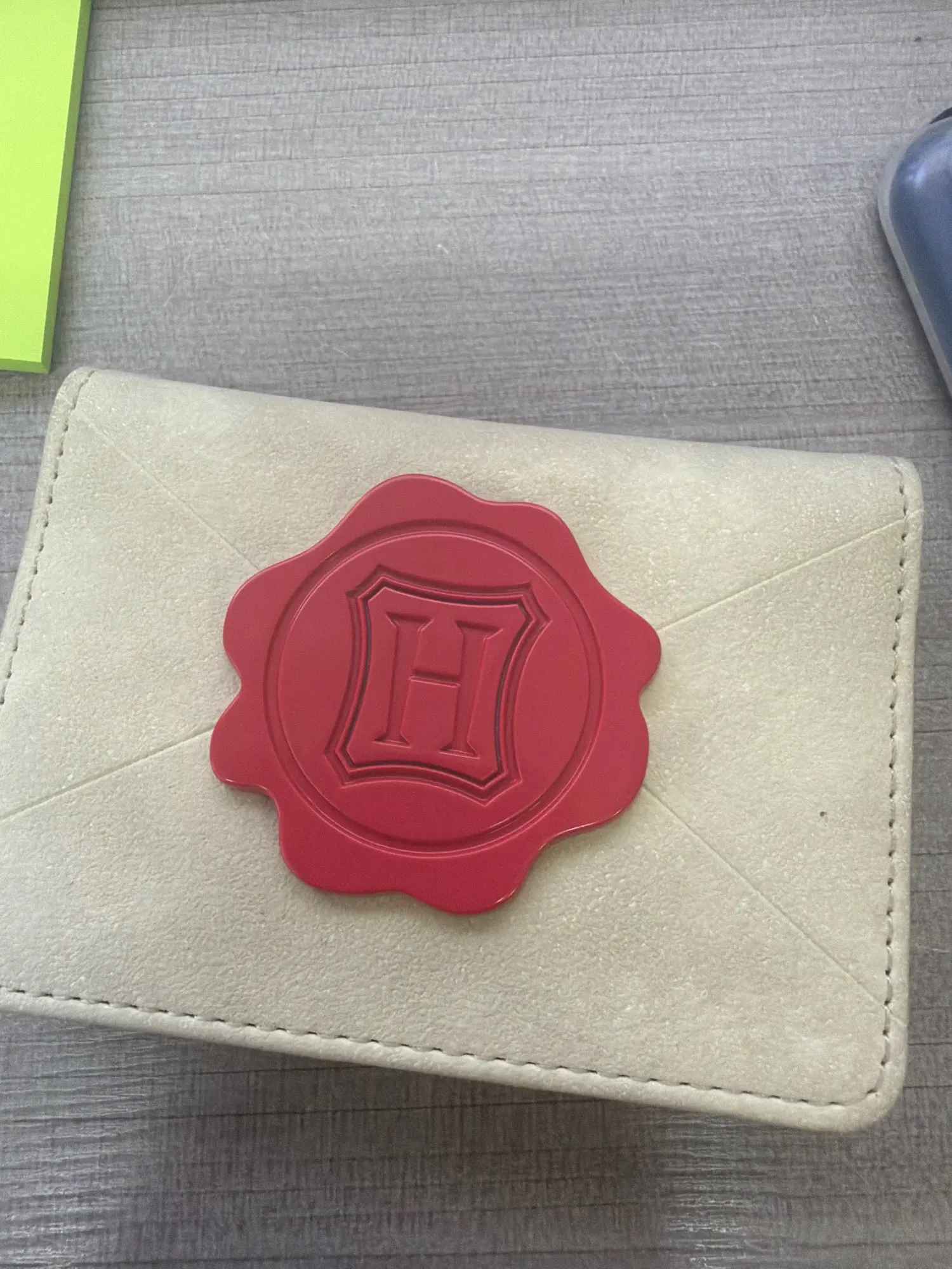 Amazing quality! Such a great little wallet for a harry potter fan. The hogwarts stamp symbol on the front of the wallet is metal.