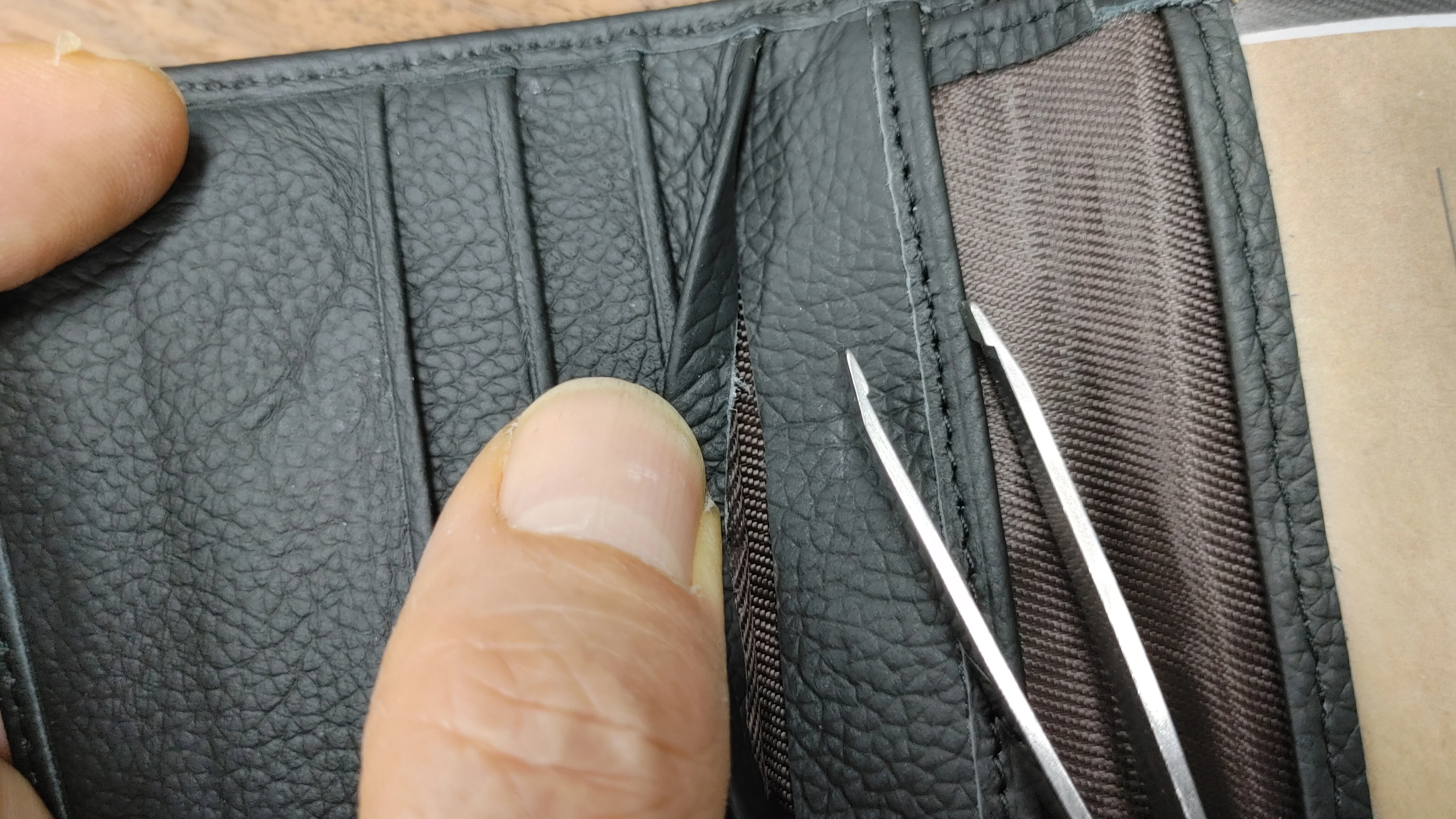 When you pull the edge with a pinset, the thread comes out as shown in the picture, which is a characteristic of genuine leather.