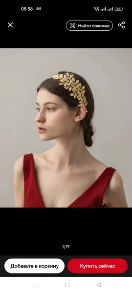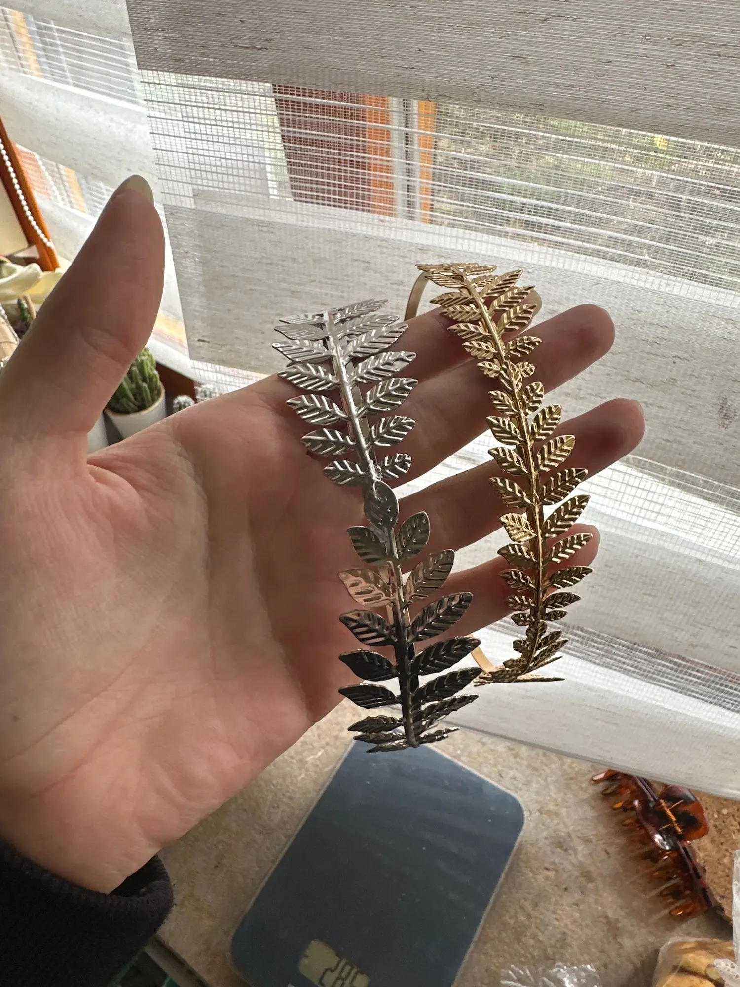 as in the photo, material is bendable metal, gold color, fits well on the head, beautiful for a photoshoot
