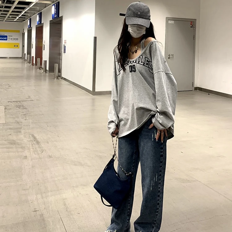 Sweat-shirt deux pièces Y2K pour femmes, hauts à manches longues