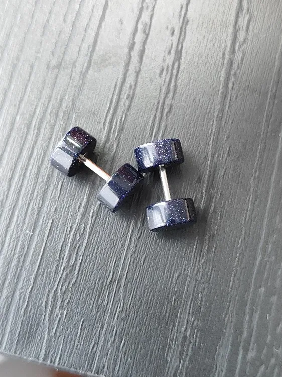 Much nicer than in store's pics where they look almost black. Stone looks like a night sky full of stars. Glitter is very discreet but noticeable. You can't quite capture it with a phone camera but it's truly beautiful. They have a nice weight and seems like they're really made of natural blue sandstone.