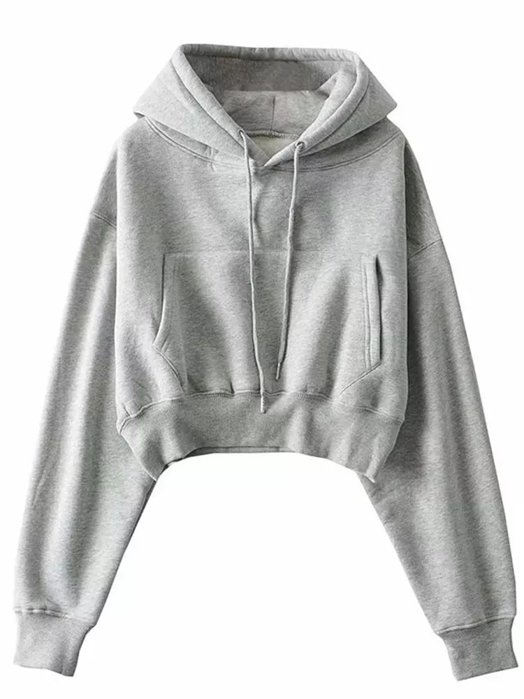 New Insfleece-lined Versatile Fashion Cropped Slims Zip-up Warm Solid Color Hooded Sweatshirt For Women