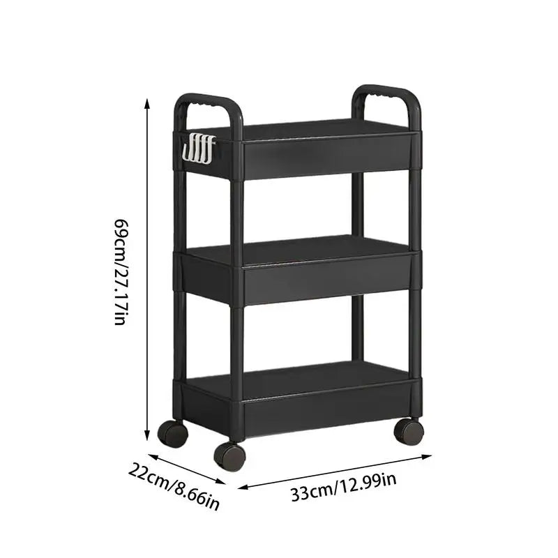 2.Vertical Space Optimization: Need more storage space in a limited area? Our rolling cart with three storage racks is the perfect solution for making the most of vertical space and maximizing every inch of your limited living or working environment.