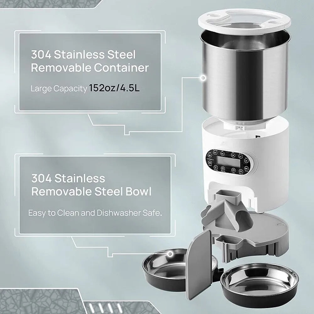 Easy & Friendly Operation - Easy installation/disassembly + clear programming allow you to get started in 5 minutes. Easy Clean & Support Dishwasher - 304 stainless steel material is easy to clean, support the automatic cat feeder's food storage containers and 2 bowls were washed in the dishwasher.(NOTE:The main unit with the display can not be washed)