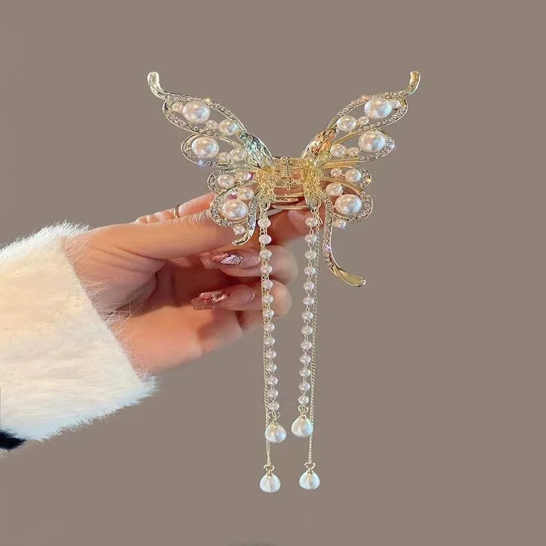 New Female Butterfly Pearl Tassel Hair Claws Rhinestone Clip Korean Simple Shark Ponytail Crab Clip Girls Hair Accessories