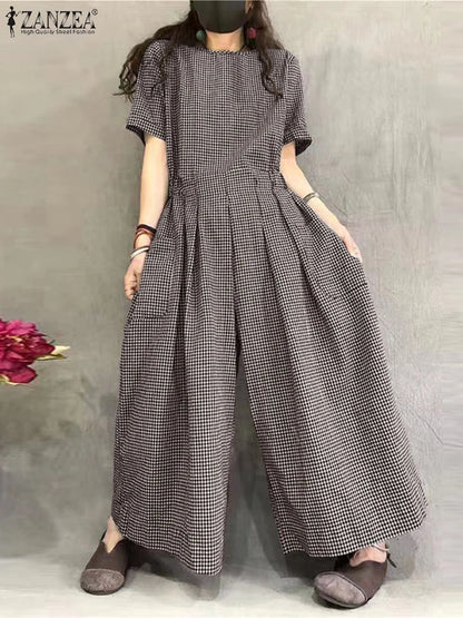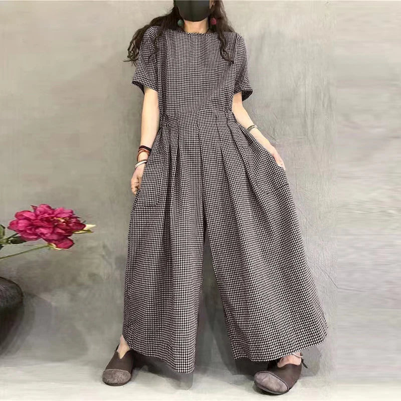 Summer Cotton V-Neck Loose Long Plaid Dresses