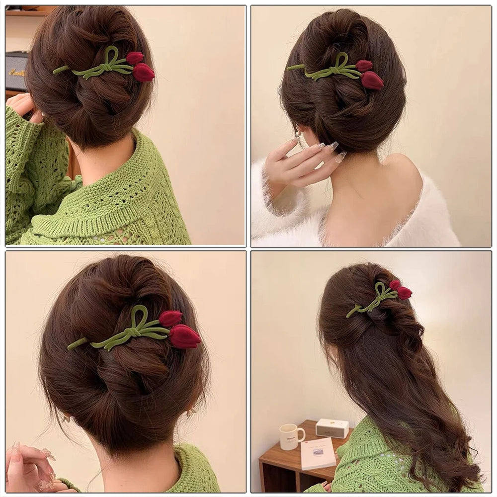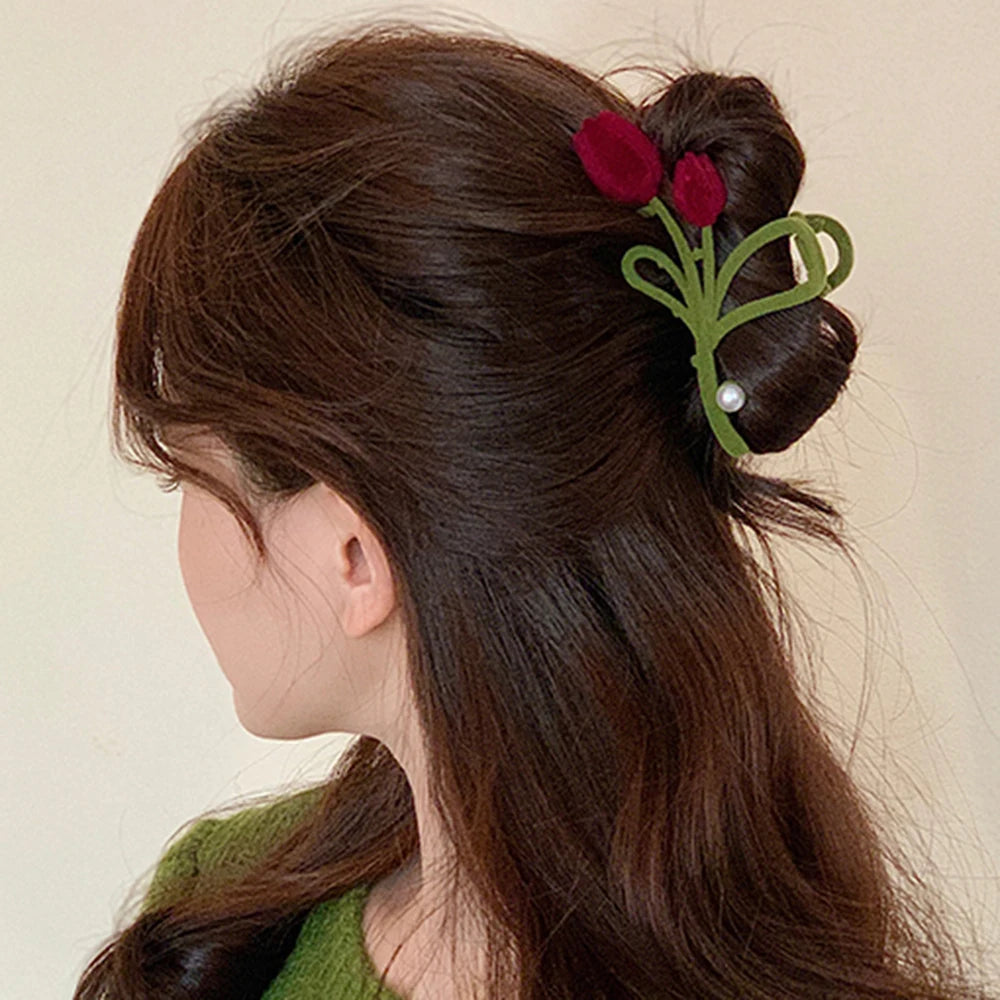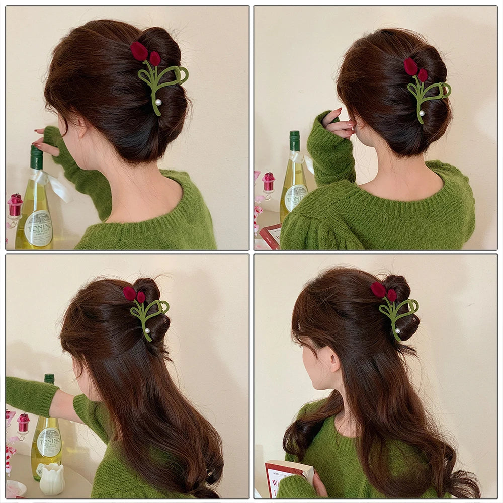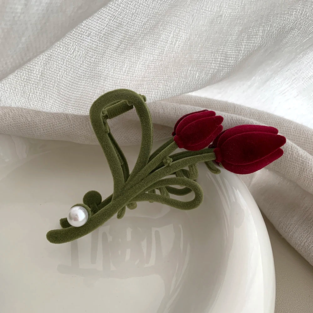 Velvet Tulip Pearl Hair Claw - Wine Red Flower Hair Clips