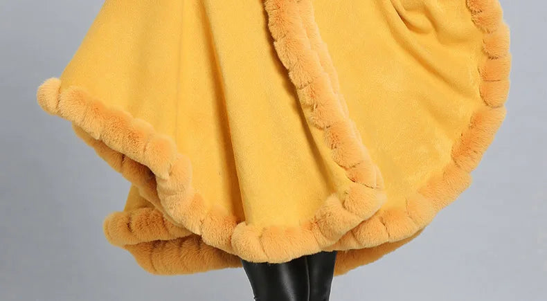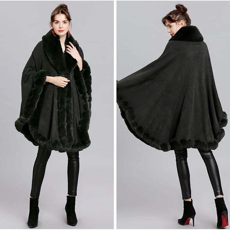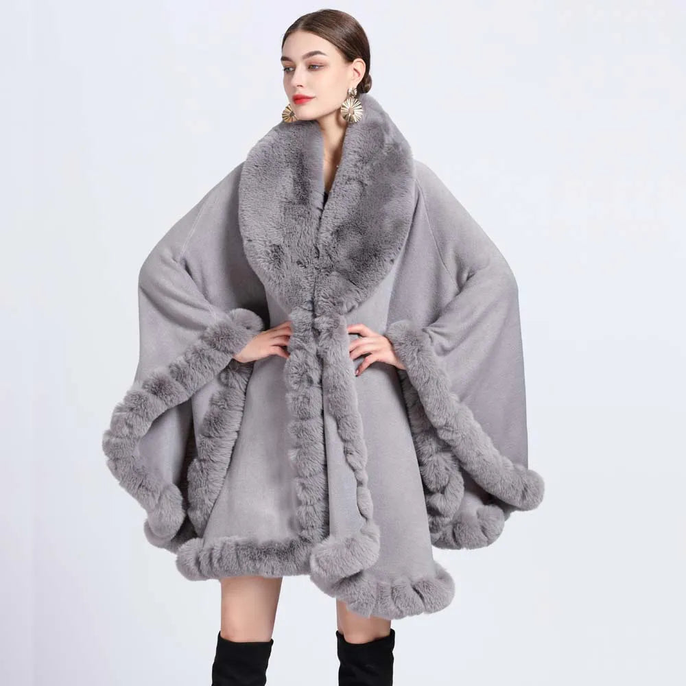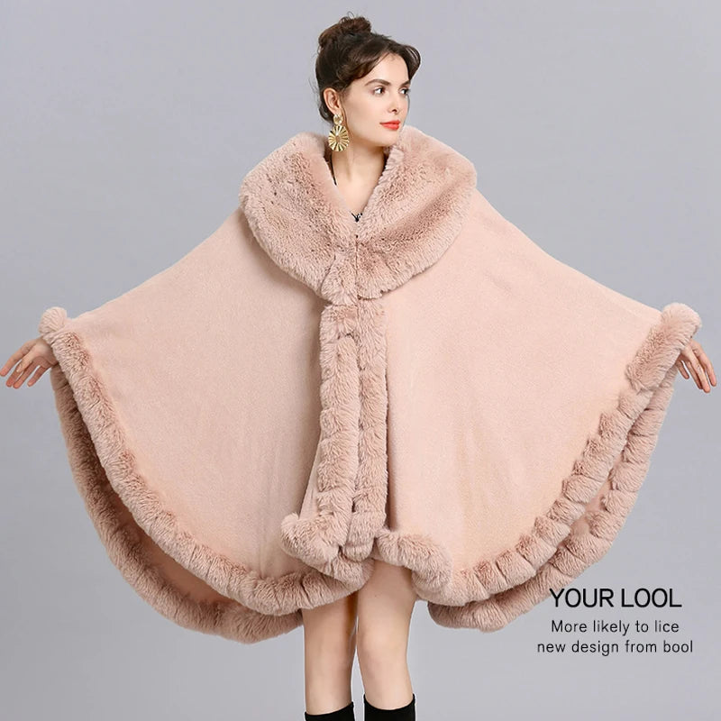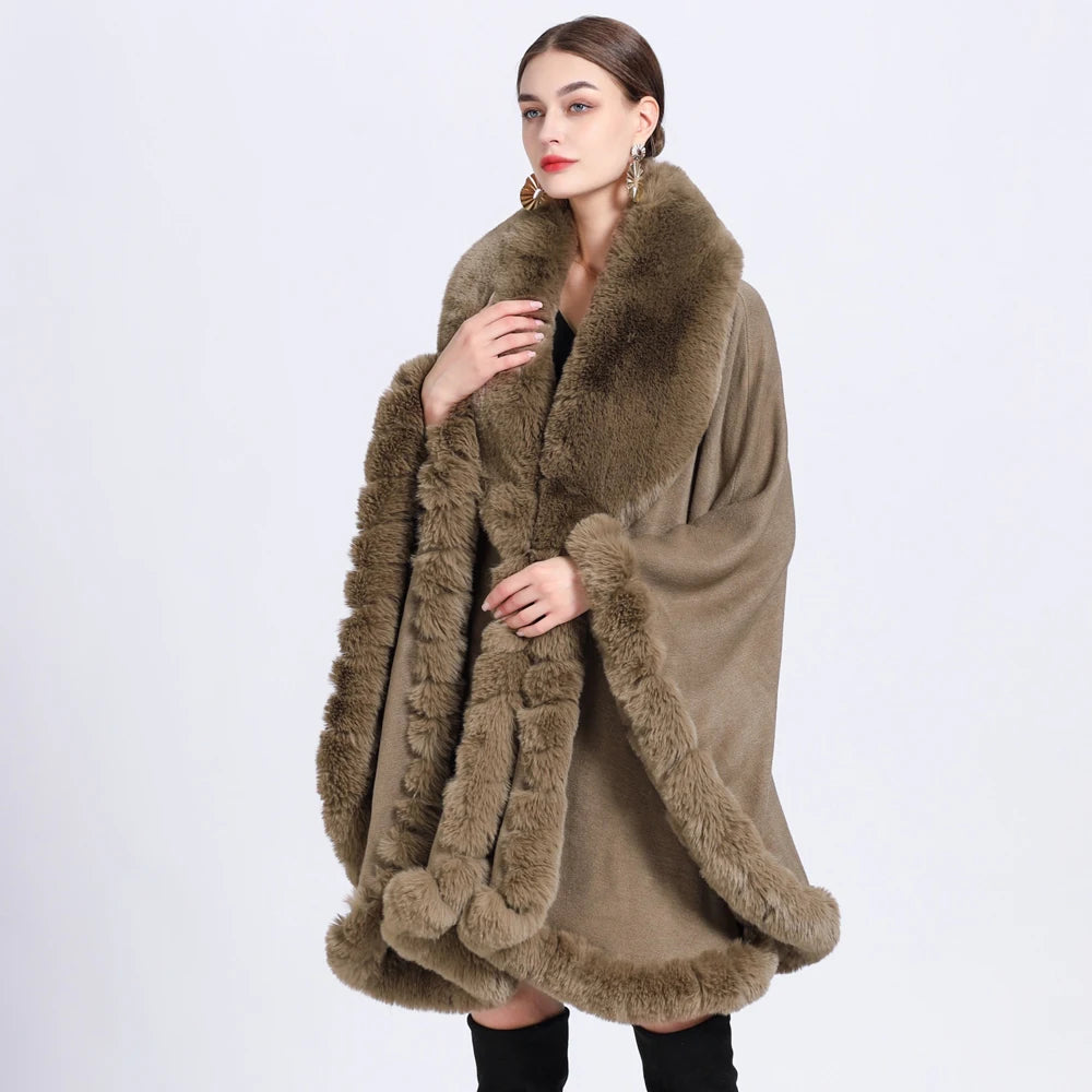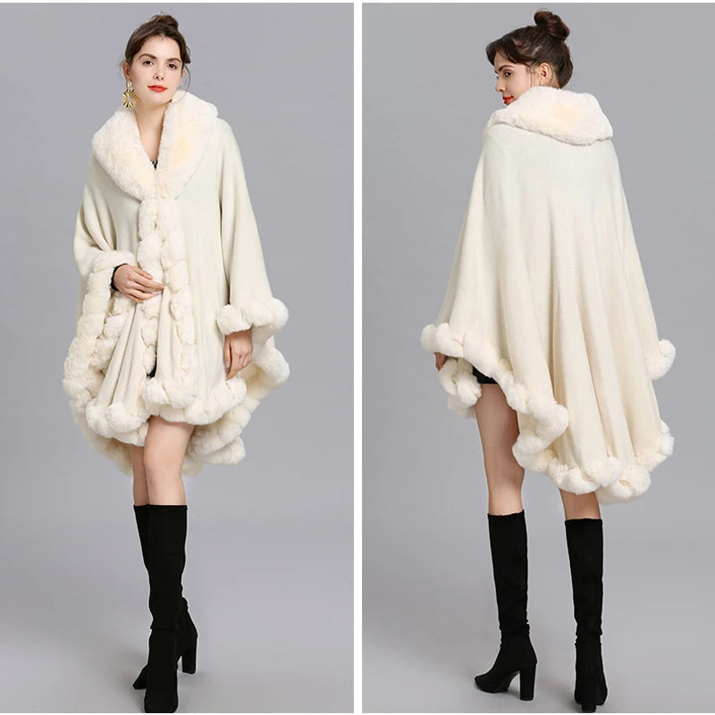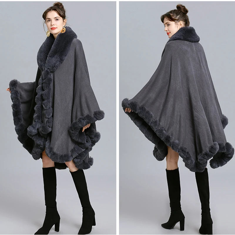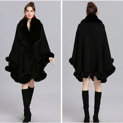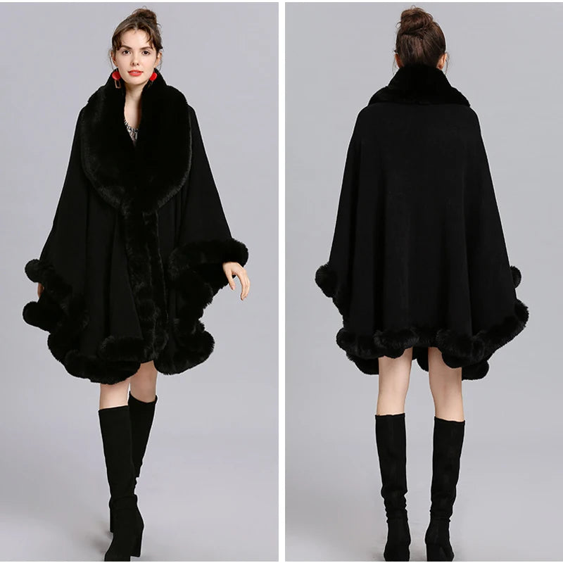 Women’s Faux Fur Trim Knitted Poncho Shawl